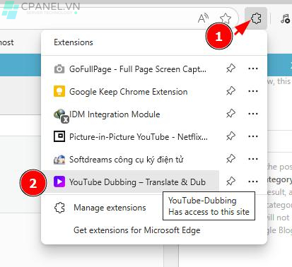 Bước 3: Sau khi cài đặt xong, kích vào mục quảng lý tiện ích, bạn có thể thấy tiện tích Youtube Dubbing đã có trên cửa sổ (nếu không thấy bạn có thể vào mục quản lý tiện tích bên dưới để tìm)