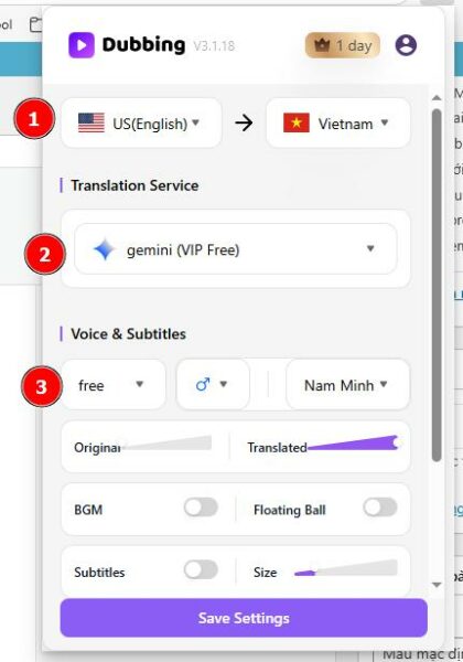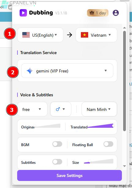 - Cấu hình các thông số dịch như giọng nam hay nữ, model người đọc, hiển thị phụ đề hay không ….